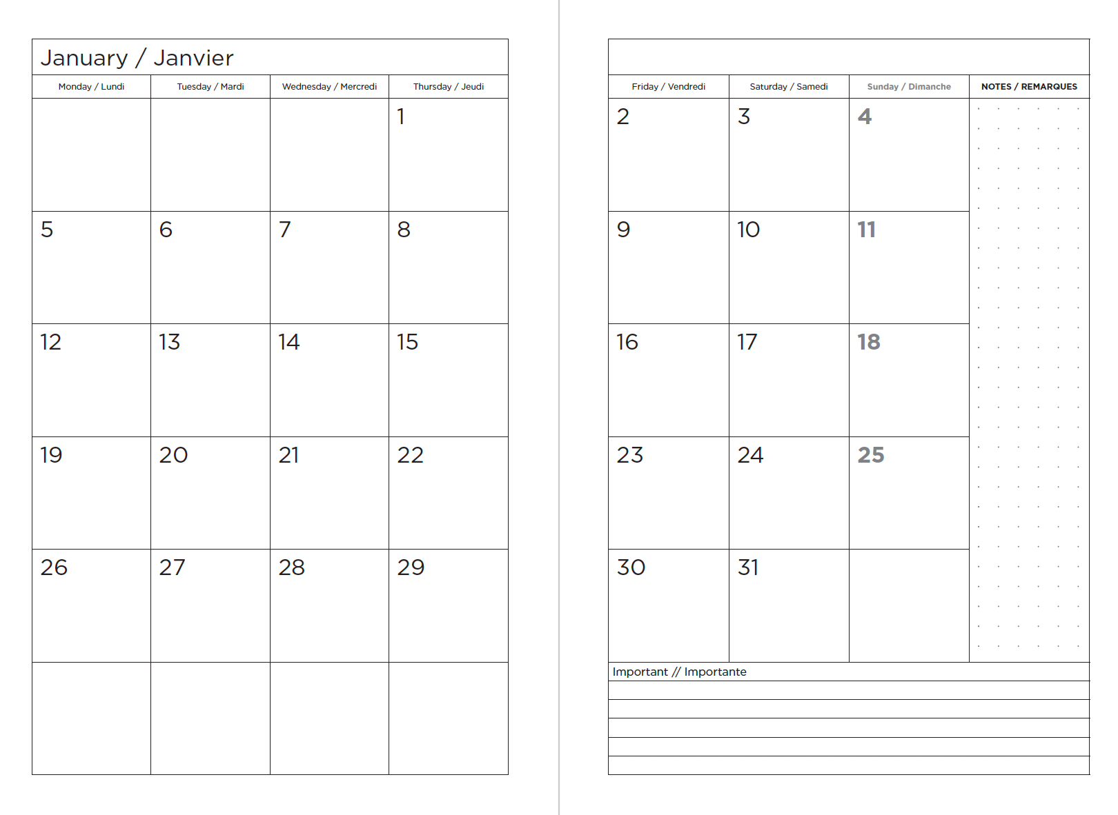 Size: 5.7" x 8.1", 432 pages, ivory paper, Monthly & Daily Layouts About this planner: 🌎 ELEVATE YOUR EVERYDAY PLANNING: This 2026 daily planner features lined ivory pages perfect for organizing your thoughts, setting goals, and capturing appointments or reflections. With both monthly overviews and spacious daily spreads, it's designed for busy minds and beautiful routines. 📔 TIMELESS VEGAN LEATHER DESIGN: Wrapped in embossed white vegan leather, this elegant planner offers a refined, classic aesthetic with a soft, tactile feel. A perfect match for those who love minimalist style with a hint of vintage charm—suitable for both women and men. 📔 PREMIUM QUALITY FOR A FULL YEAR: Crafted with 432 pages of high-quality paper, this dated agenda includes important dates for the US & Canada, plus a thoughtful year-end review section for 2026—ideal for journaling, goal-setting, or reflection. 🌓 Bilingual English and French.