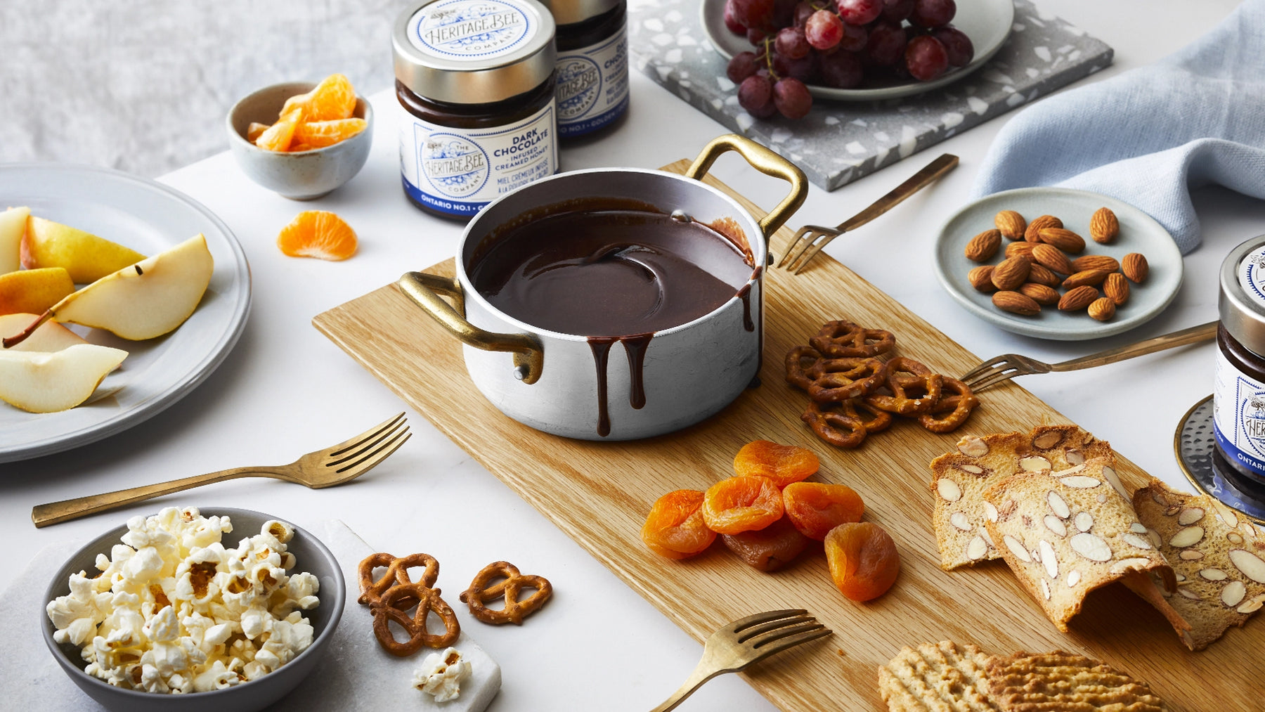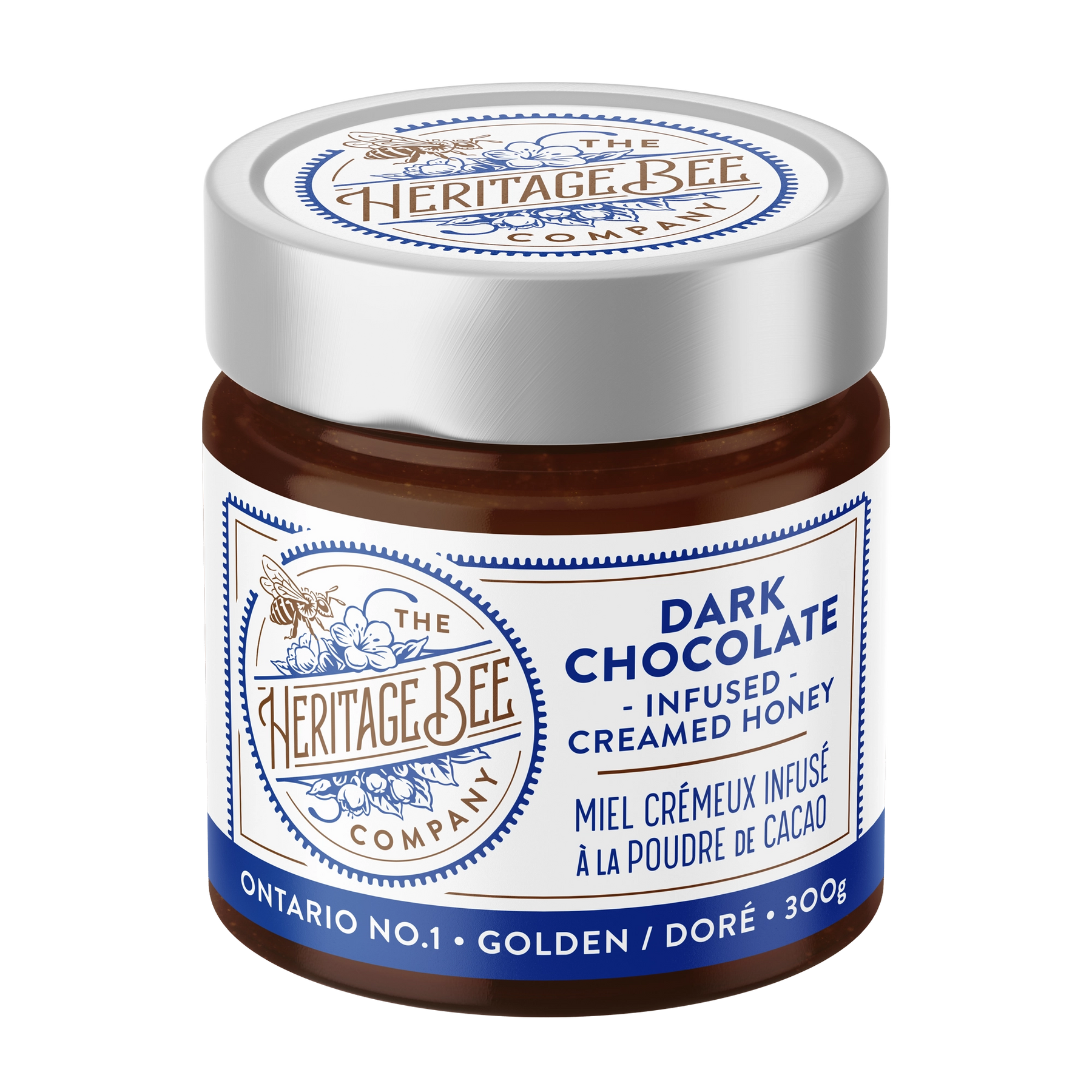 World's premium extra-brut Cacao Barry pure cacao infused with our 100% Ontario Creamed Wildflower Honey. A mouthwatering, bright, intense deep rich chocolate flavour with a delectably smooth finish. A dairy-free way to enjoy dark chocolate.