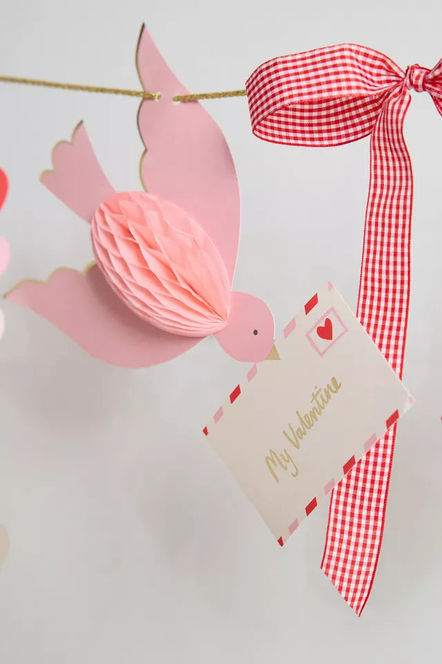 Love is in the air! Hang this romantic Parisian garland to make any space special. Perfect for your porch, doorway, wall, or above your party table, its modern mix of pink and red, along with gingham ribbons and 3D hearts, adds a memorable touch. It works equally well as a Valentine's party banner or a bridal shower decoration. Pack it away after use and bring it out each year to keep the love alive.