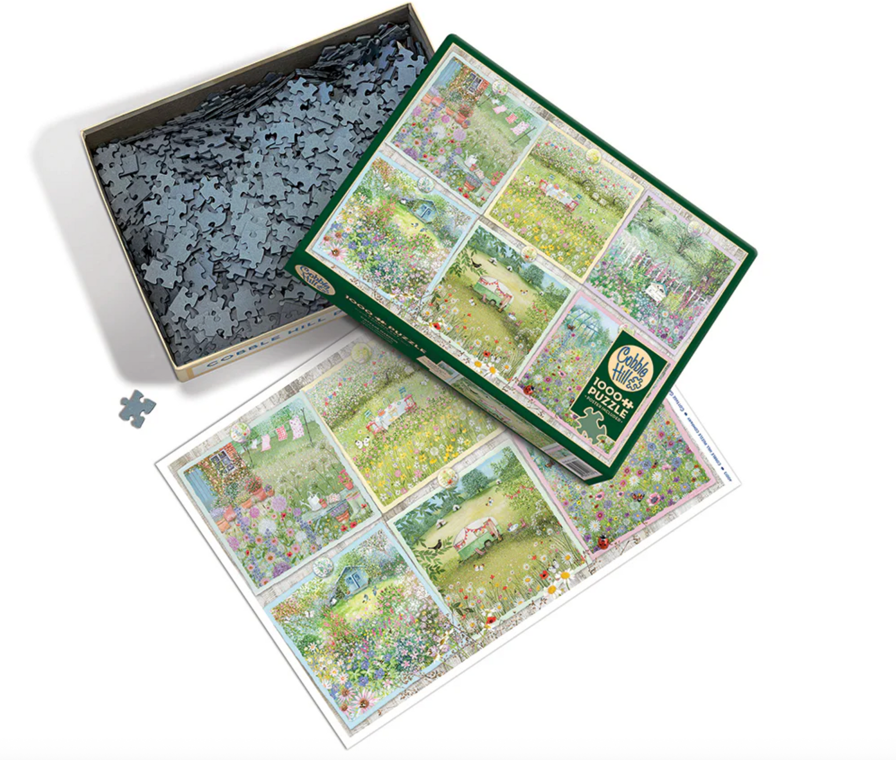 Cottage Gardens 1000 piece puzzle features six whimsical scenes of flower fields, cute camper, a greenhouse, and a lovely little cottage. The scenes are postcards pinned to a wooden board. Would these pretty pastel scenes be on your vision board?