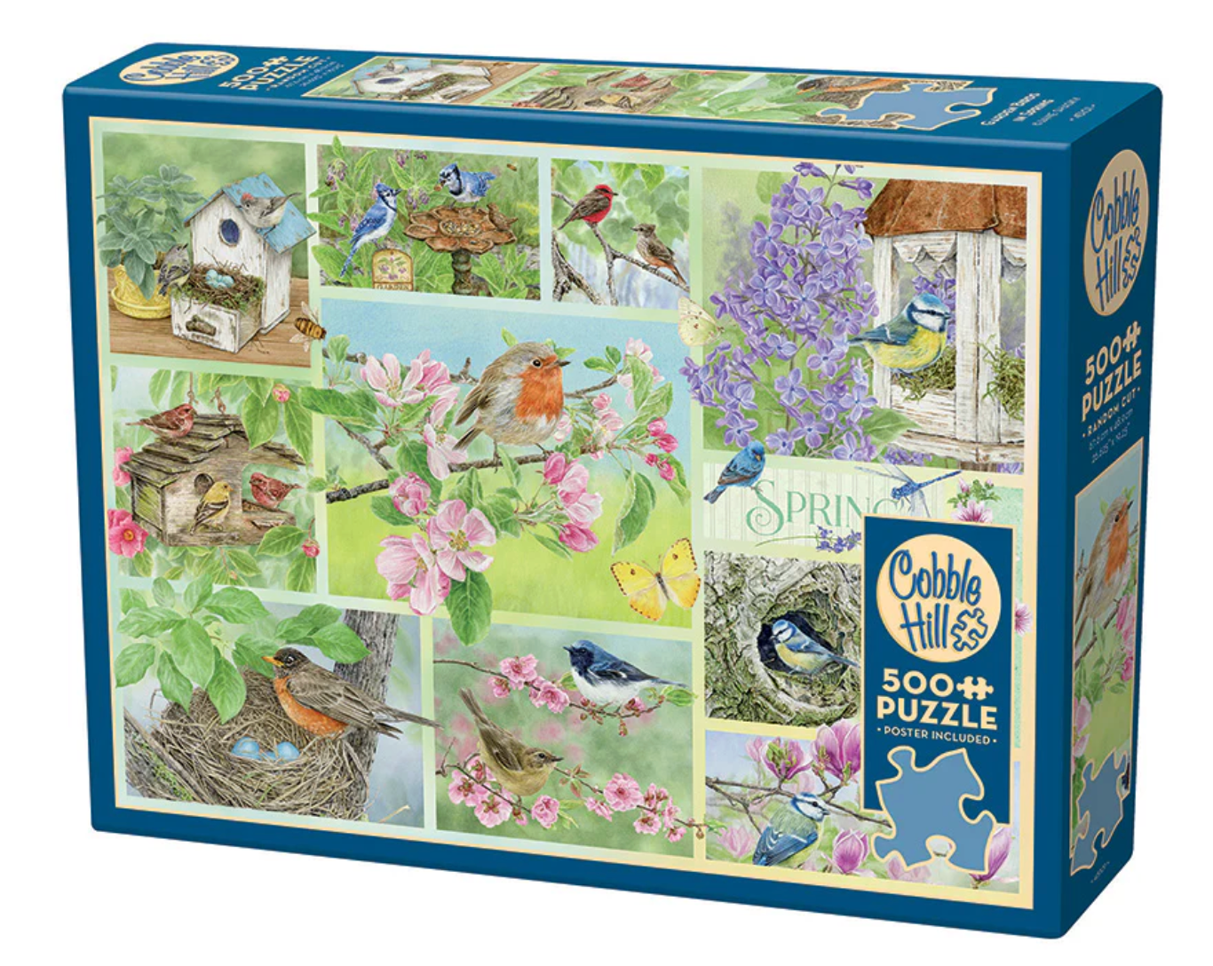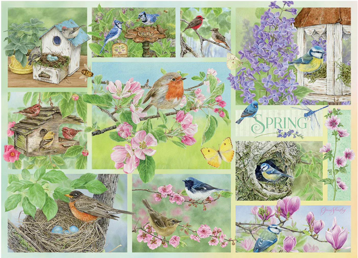 Explore the beauty of spring with Garden Birds in Spring, a 500 piece puzzle showcasing the watercolour artistry of Jane Shasky. Part of a series celebrating each season, this collage is bathed in a palette that perfectly captures the essence of spring. Birds tend lovingly to their eggs in nests, enjoying lively conversations with feathered friends amidst fluttering dragonflies and butterflies. Soft greens and delicate pink petals adorn the budding trees, painting a chipper scene.