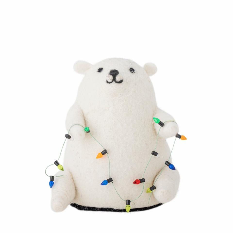 Felted polar bear made of wool, holding a colorful string of lights in its arms.