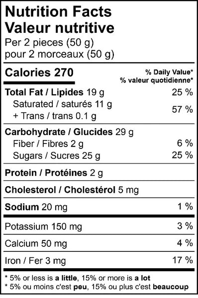 Chocolate (sugar, cocoa liquor, cocoa butter, whole milk powder, butter oil, sunflower lecithin, soy lecithin, natural vanilla), Peppermint candy (sugars [sugar, corn syrup], peppermint oil, erythrosine, allura red, brilliant blue FCF, palm oil), Natural peppermint flavour.