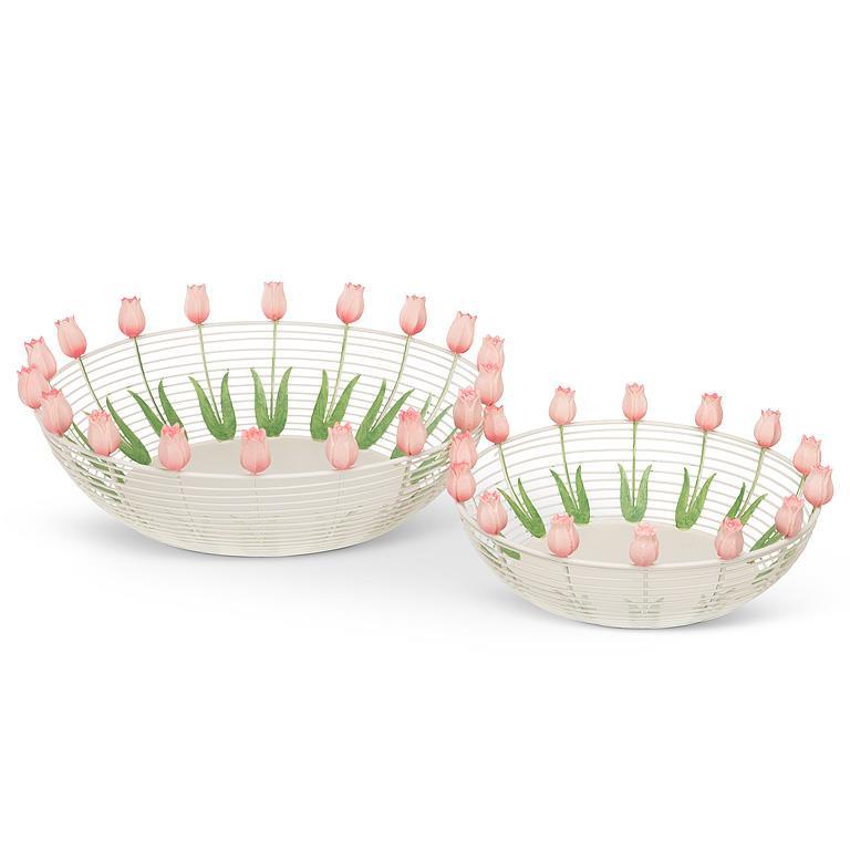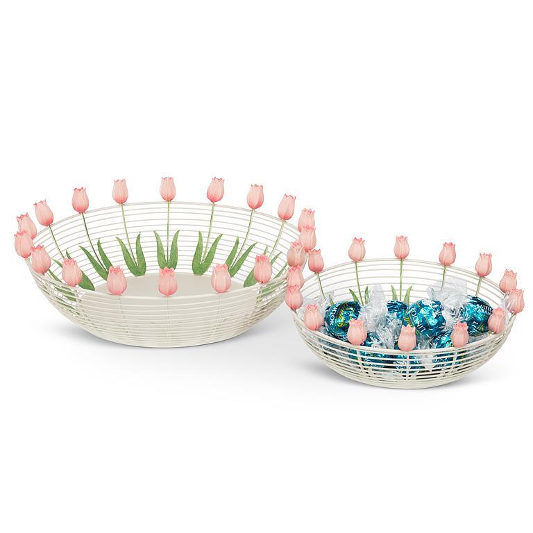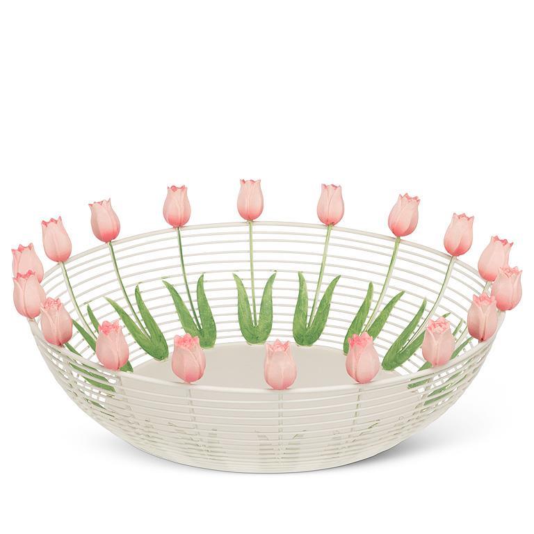 Small: This small, shallow metal basket is adorned with pale pink tulips sprouting from the rim. Finely crafted from metal, these flowers will bloom year-round. Fill with a few bunny figurines and you’ll have an Easter Basket to envy.7"D