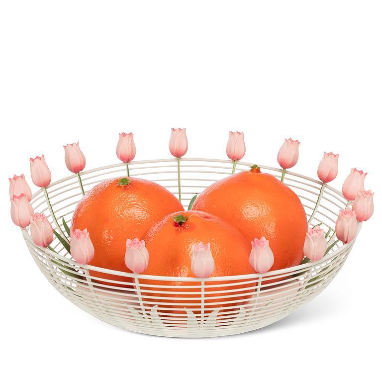 This large, shallow metal basket is adorned with pale pink tulips sprouting from the rim. Finely crafted from metal, these flowers will bloom year-round. Fill with a few bunny figurines and you’ll have an Easter Basket to envy.9.5"D
