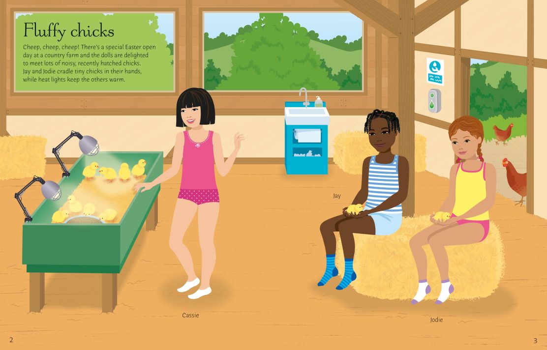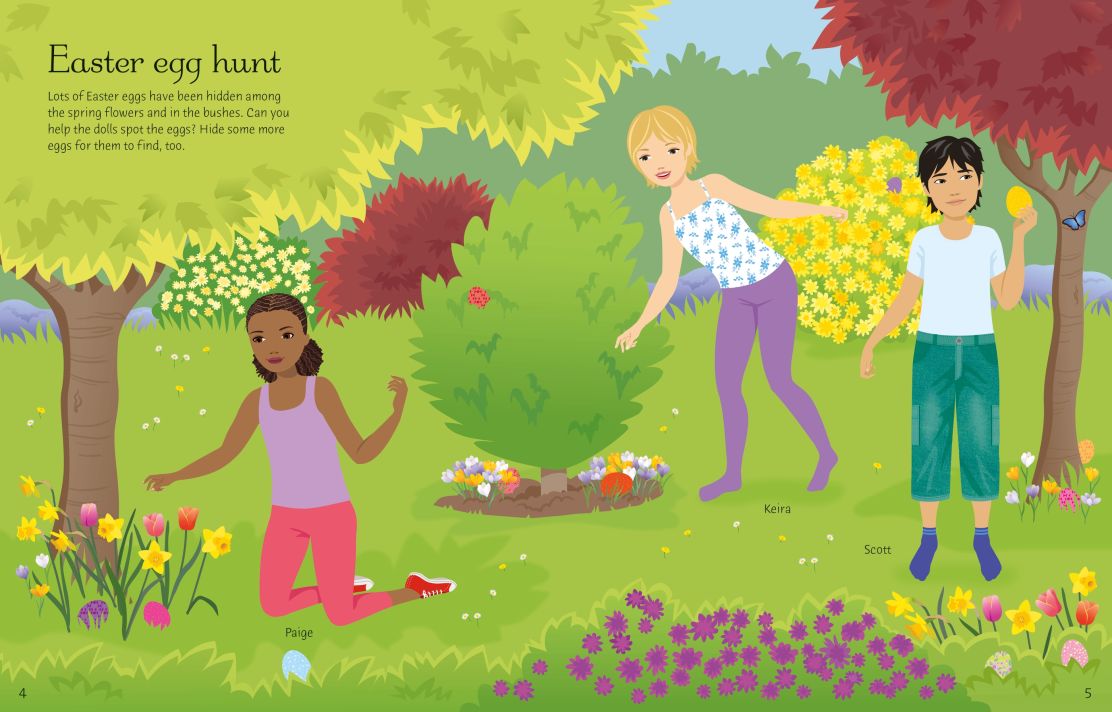 Have fun choosing the stickers to create outfits for the dolls as they go on an Easter egg hunt, feed hungry newborn lambs, decorate eggs, plant Spring flowers and handle day-old chicks.