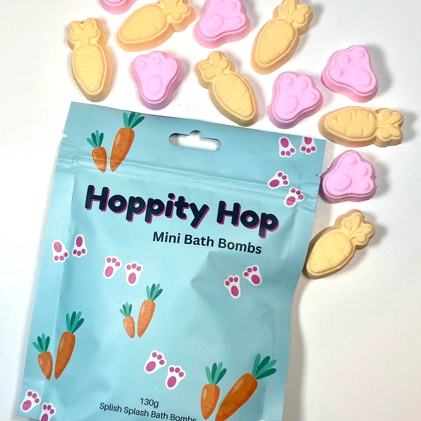 The Cutest Mini Bombs just in time for Easter. Kids will love these mini Carrot and Bunny Foot shaped bombs which are scented in Chocolate. Tons of Fun but with No Sugar!!