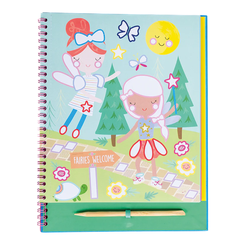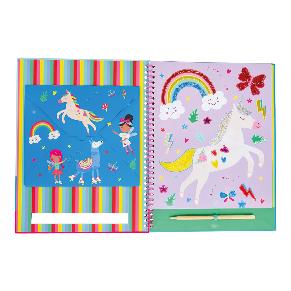 Make everything shimmer and shine with 8 fun illustrated pages to decorate! Peel off a white sticker, select a foil sheet and rub it onto the sticker area using the wooden stylus to make an amazing picture! This Rainbow Fairy design contains 20 different colour foiling sheets, 8 pages and a wooden stylus – all in a handy spiral bound book.