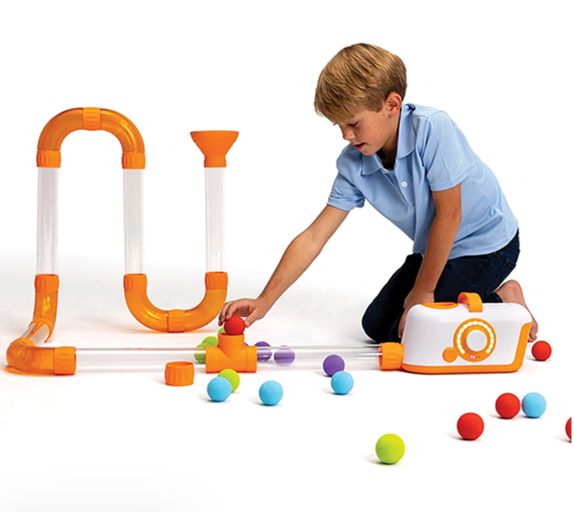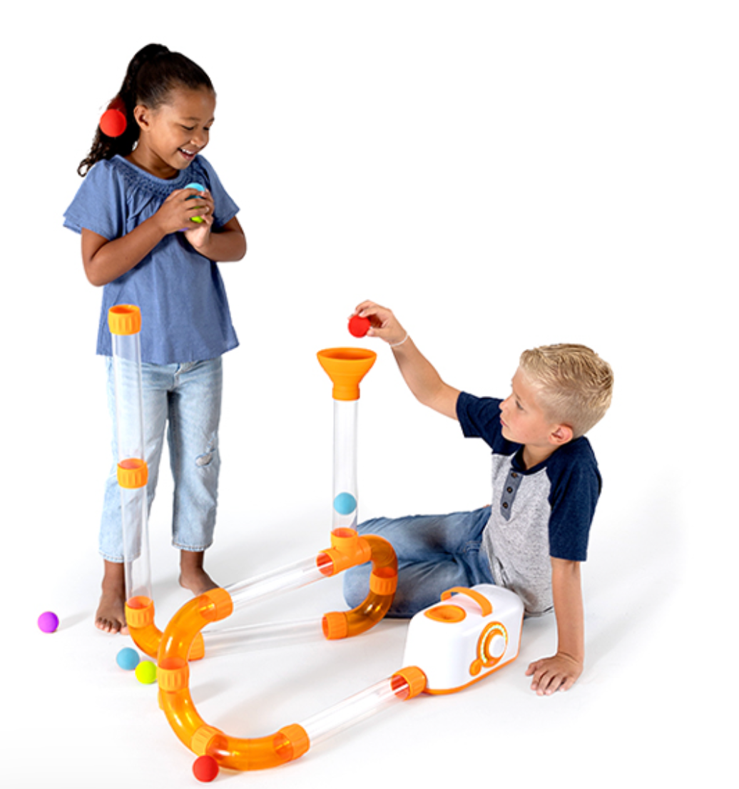 - Kid-safe fan that sends foam balls flying through a network of modular tubes