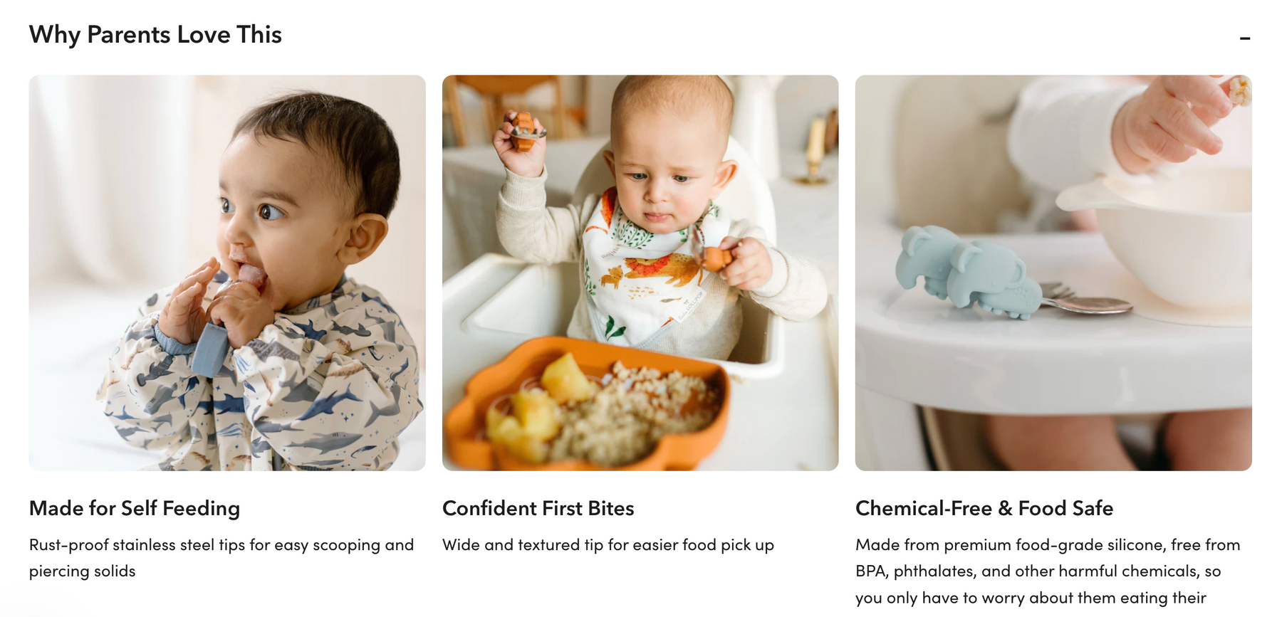 Our toddler spoon and fork set is made for self-feeding, with chunky, easy-grab handles that help little hands learn to scoop, stab, and snack all on their own (so less food ends up on the floor!). Crafted from buttery-soft, food-grade silicone and durable stainless steel, and topped with our adorable animal characters, they're the perfect mix of safe, functional, and fun.
