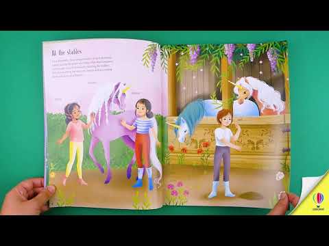 Enter the magical kingdom where princesses look after unicorns, ride them as they fly into the sky, take them on a snowy walk and exercise them on a beach. Use the stickers to dress the dolls and decorate the fantastic scenes.