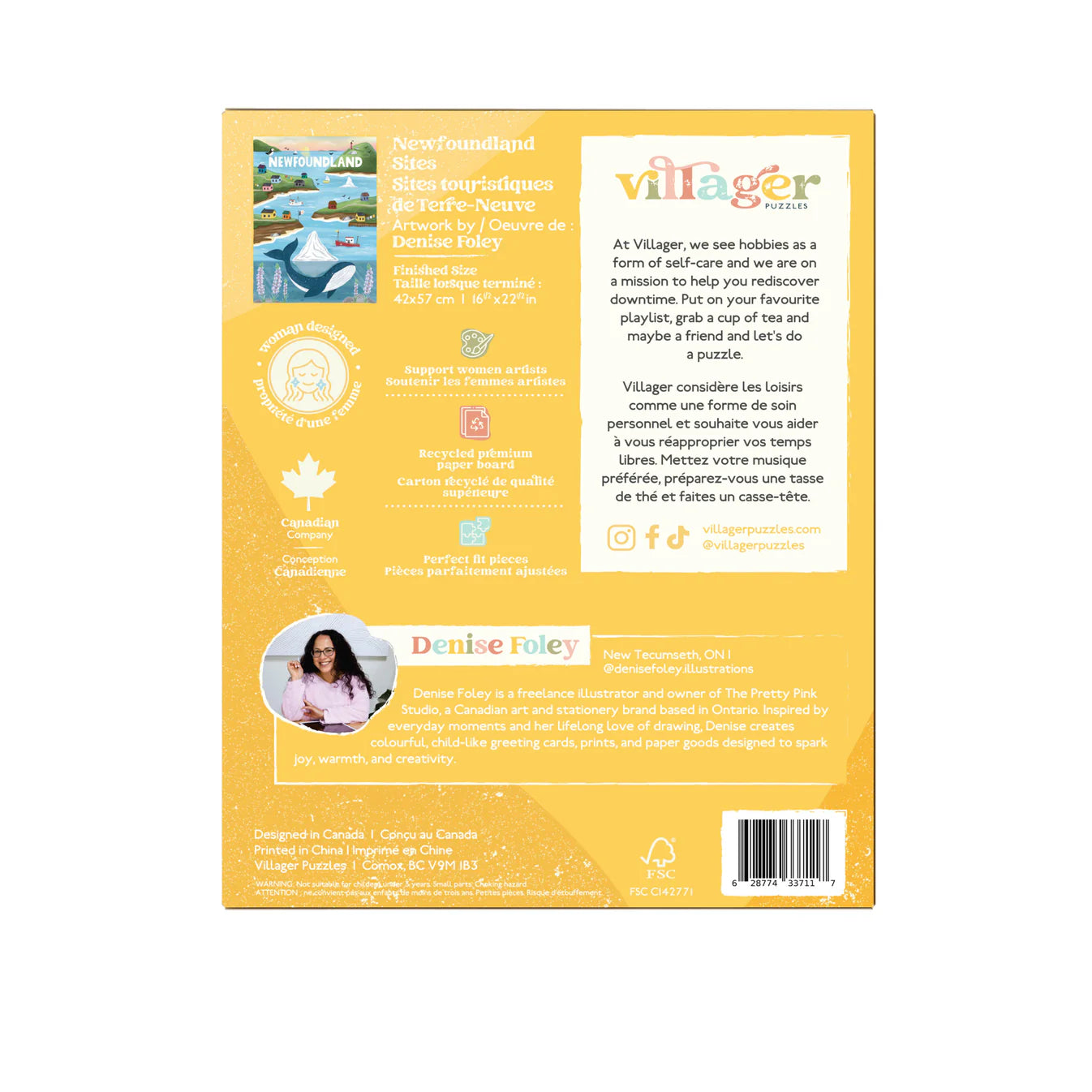 Imagine standing on the rugged shores of Newfoundland, the salty ocean air on your face and a glowing sunset over colourful houses and fishing boats. In this puzzle, artist Denise Foley captures rolling landscapes, whales, icebergs, and lupine wildflowers, along with the Newfoundland flag tucked into the scene. Inspired by family trips and the island’s welcoming spirit, every detail reflects the peace, joy, and sense of belonging that make Newfoundland feel like her home away from home.
