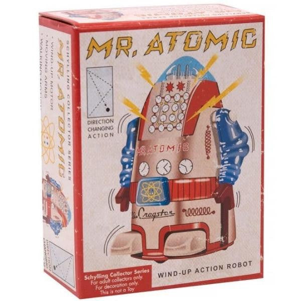 With his swinging arms and vintage look, Mr. Atomic moves his feet as he walks forward! Just wind him up and watch as he twists and turns across any smooth surface.