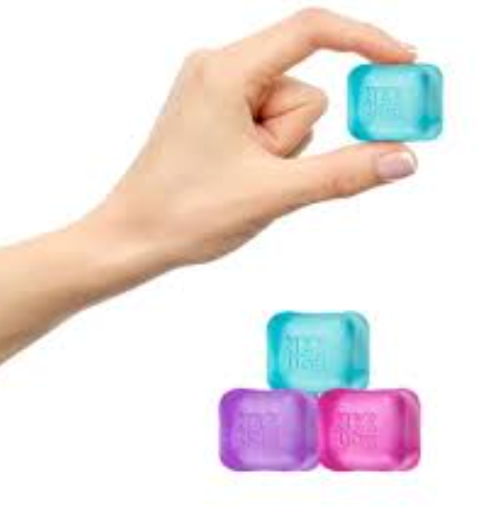 These mini NeeDoh Nice Ice Baby cubes offer a satisfying sensory experience, feeling soft when slow-squished and firm when fast-squished. Designed to be squeezed, stretched, and squished, each cube consistently returns to its original square shape.