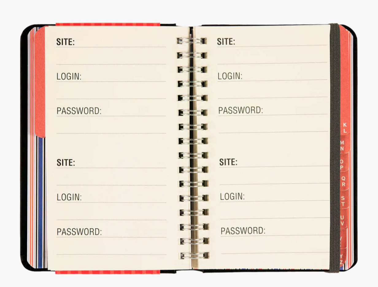 Time- and headache-saving little volume is organized with tabbed A to Z pages, with space on each page to write down websites, usernames, passwords, and extra notes.