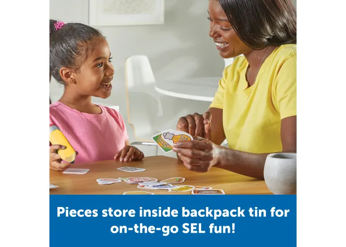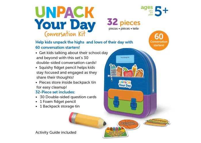 - Pieces Store Inside: When chats are done for the day, the Unpack Your Day Conversation Kit’s pieces return to the fun backpack tin for easy clean-up!